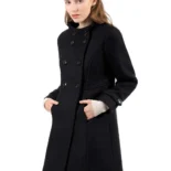 Elegáns, fekete dupla soros télikabát állógallérral és ferde zsebekkel. Stílusos és meleg viselet a hideg napokra.
