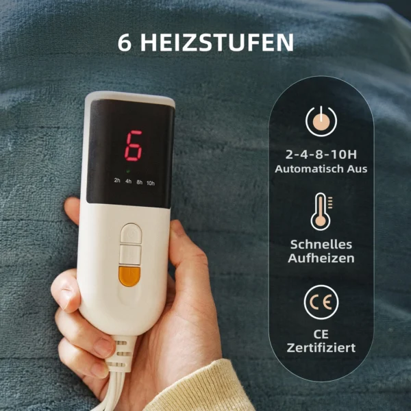 Puha, nagyméretű (130×180 cm) elektromos takaró 6 hőfokozattal és 10 órás automatikus kikapcsolással.